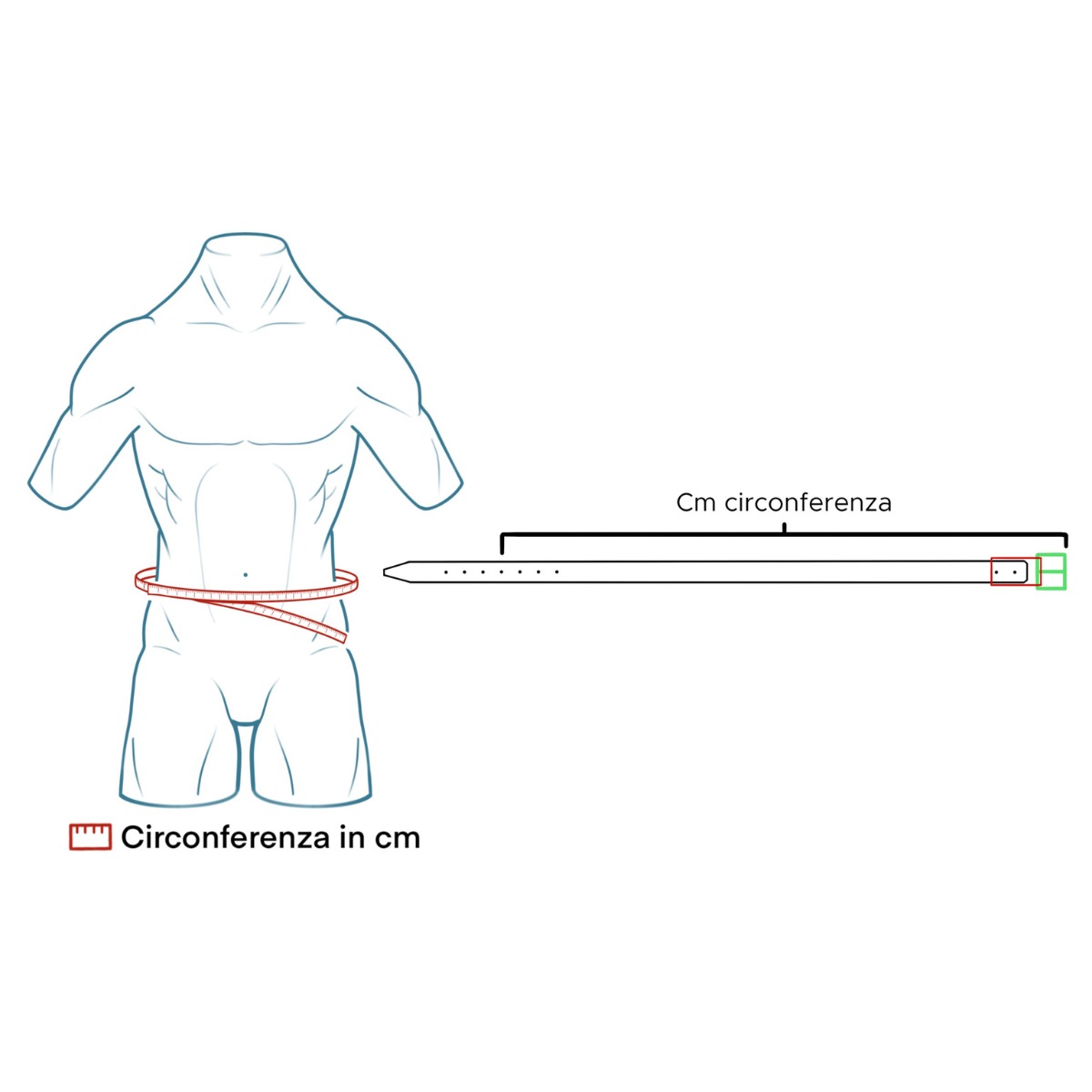Prendi una cintura che usi abitualmente e misura la distanza tra il foro che utilizzi di solito e l’estremità della fibbia. Indica questa lunghezza al momento dell’ordine per ricevere una cintura su misura artigianale, creata esclusivamente per te.